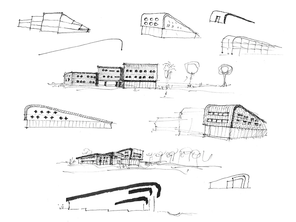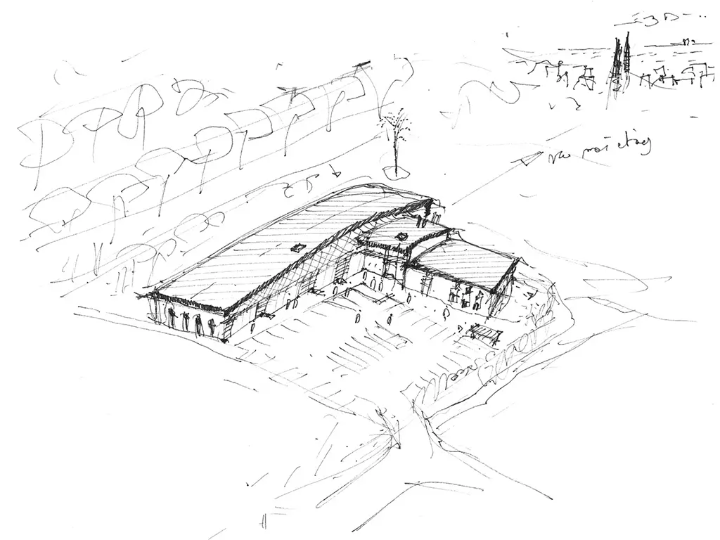 À simple RDC au Sud il monte progressivement jusqu’à R+2 en façade Nord. La poupe ancrée dans les terres agricoles, sa proue côtoie la mer et le ciel. Sa couverture est la façade principale qui relie la terre, la mer et le ciel, tel une voile courbe, les ailes d’une raie, une courbure de mammifère marin…